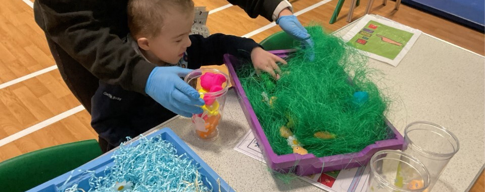 The hall was buzzing with excitement as pupils explored a wide range of engaging activities designed to suit everyone. From colourful Easter crafts to sensory play with rice, there was something for everyone. The “find the egg” challenges proved especially popular, while the chocolate-scented bubbles added a unique and memorable twist. A definite highlight of the morning was the much-loved switch operated “Big Chick Launcher” which brought lots of laughter and smiles!